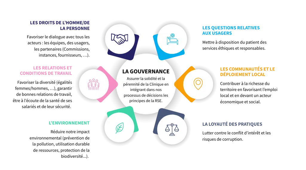 - La Gouvernance : Assurer la solidité et la pérennité de la Clinique en intégrant dans nos processus de décisions les principes de la RSE. C’est la stratégie RSE que se donne la Clinique et l’organisation de son déploiement.